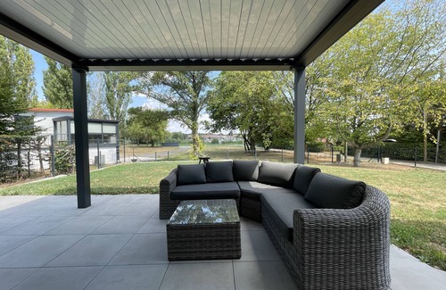 Outside, under the pergola, there is a corner lounge, a garden table, a brazier and a pizza oven available during the summer season.