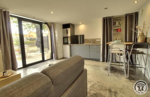 Single level accommodation for 2/4 people, just 16 km South of Lyon. Very easily accessed via A7 motorway. It ajoins owners' home and second lodging. Modern decor (stone walls, polished concrete, screed floor). Living room (fully fitted kitchen area, dining area, lounge area with double sofa bed). Bedroom (as desired, two 90 x 200 cm beds or king size bed). Shower room including WC. Baby equipment on request : cot, high chair, buggy. Owners' tumble dryer & deep freeze available on request. Outdoors : gravelled private terrace (garden furniture, sunshade). Shared with owners (and their children) : barbecue, plancha (or electric barbecue on request), garden, soccer goals, badminton, table tennis. Local partnerships have been set up by owners for guests to benefit from reduced prices by shopkeepers/craftsmen/winegrower.