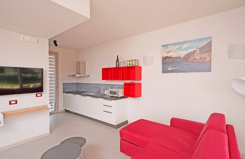 We warmly welcome you to our Residence Gardaliva built in 2019!Located about 450 meters on foot from the beach and the lakefront, the residence has 5 apartments of different types, studied in detail and tastefully furnished, offering guests comfort and style.The complex is surrounded by a lovely well-kept garden with an infinity pool and each apartment has a reserved parking space.The Red Duplex 1 apartment, divided over two floors, is an elegant and refined solution, ideal for families, completely newly furnished, and equipped with TV, Wifi and air conditioning.On the ground floor there is a large living room with sofa bed, dining table with chairs, kitchen equipped with dishwasher, induction hob, oven, fridge, coffee machine and kettle and toilett without shower..The living room leads to a spacious covered terrace, furnished with table, chairs and sun loungers.From here there is access to the common garden and the swimming pool suitable also for younger children (minimum depth 0.50 m).The sleeping area is located on the first floor and consists of a double bedroom with TV, a bedroom with two single beds, a third open space area with a foldaway double bed and a large bathroom with shower.The double bedroom leads to the covered terrace furnished with comfortable armchairs and from which you can enjoy a beautiful view of the lake and the swimming pool.A shared washing machine is available free of charge for our guests.Residence Gardaliva is a perfect place for a family holiday or a romantic stay for a couple.All our guests will receive a welcome gift with typical products of the area.Manerba del Garda is also a starting point for bicycle excursions and visits to local wineries.In a few minutes you can reach the Romantica beach, restaurants and pizzerias, a small supermarket and the mini golf course.To experience strong emotions, we recommend our guests a visit to the Rocca di Manerba, a site of great archaeological importance and a strategic point to dominate the lake from above.For shopping, you can reach Salò or Desenzano, about 12 km away.To spend a day full of fun, the famous parks such as Gardaland, Movieland or the Caneva water park, are about 35 km away. Ask for discounted tickets at your check-in.Tourist tax € 1.60 per person per dayIt is strictly forbidden to charge the electric car with the house electricity.the accommodation is for a maximum of 6 people including infants. We never accept more people than 6.