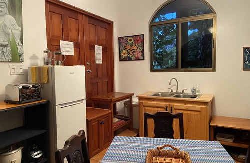 You'll find yoga mats, umbrellas, cloth shopping bags, flashlights, extra blankets, shampoo, cream rinse, shower gel and a hair dryer. The kitchen has a sink, refrigerator, 2 burner electric stove top, microwave, convection oven, electric kettle, toaster, rice cooker, blender and everything you require to prepare meals.