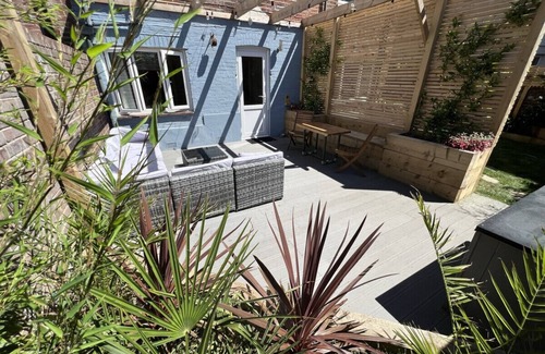Stunning newly refurbished 2 bedroom, 2 bathroom garden flat with private parking with the beach at the end of the road , hosted by Home from Home Portsmouth. Great for access to the attractions, suitable for families and dogs with a private secure garden, split into areas: a sheltered decked area with pergola for the outdoor lounge and dining as well as a grassed area for dogs and kids to play and a patio area attracting the morning sun, with bistro table, bench and charcoal BBQ.