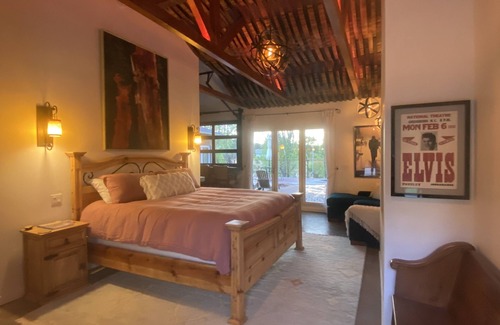 This gorgeous large room-studio has vaulted ceilings, hand crafted, with wine barrel staves. This spacious studio has all the upscale amenities one could ever desire... Amazing Lake view, gas fireplace, 70-inch TV, indoor-outdoor bar, with electric garage door-window, accordion 3 door sliders that completely open onto a large deck. The lake has all kinds of wildlife... geese, ducks, birds, egrets, cranes, frogs, deer, fox, etc… The kitchen is fully equipped, with high end appliances and cookware. Everything is brand new! There is a Speed-Queen washer and dryer. The marble bathroom floors & shower floors are heated. The shower has vaulted ceilings with a huge skylight. The toilet includes a remote with bidet features and a heated seat. The property has a custom barn with mules and goats, 2 vineyards, a kidney shaped pool, your deck has a spacious 8–10-person spa. Take a walk around the lake and property, to see the vegetable and herb garden, sample the grapes and meet the animals. We are also just a short walk to the local bar, restaurant and market. Enjoy the gas fire pit, on the deck, above the pool area. There is a grill at the pool area and also on your deck, right outside your sliders, to the right. Please come and enjoy this little slice of heaven.