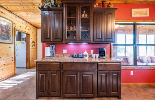 Cedar Ridge Lodge sits atop a wooded ridge on 100 acres of private, gated property called Mountain Vista Retreat. With breathtaking panoramic views, the spacious and well-appointed 3,714 sq. ft home offers the perfect getaway for groups and families seeking a rustic setting with modern amenities. Whether you relax on site or venture out into McCurtain County for nearby outdoor activities or points of interest, a stay at the Lodge will be memorable! *** NEW in 2025 fiber internet ***