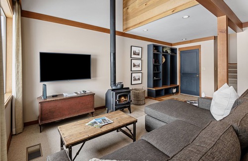 MAIN FLOOR | The main floor has an open living room, dining room, breakfast bar, full kitchen, and a half bathroom. The kitchen is equipped with everything you need to cook and dine for up to four Guests. The dining area flows comfortably out onto the golf course side deck complete with outdoor furniture and a BBQ for grilling. The living room has a wall of windows and a cozy wood burning stove. Firewood is provided.