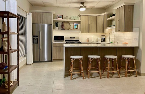 The fully stocked kitchen has new custom cabinets, stainless steel appliances and white quartz countertops. The in-unit reverse osmosis system, with remineralizer, eliminates the need for bottled water and the refrigerator has additionally purified water and ice dispenser. Enjoy your meals at the large peninsula or on the veranda for a sunset dinner.