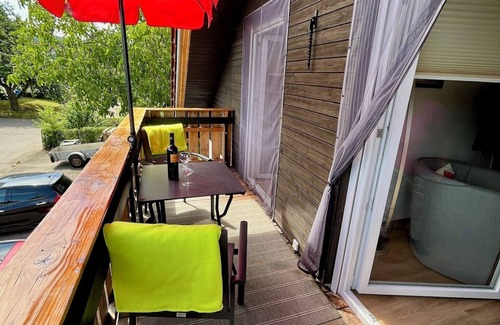 The balcony has a table and 2 chairs and a parasol and 2 more small deck chairs .