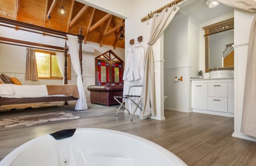 Warm earthy tones in a bohemian style, the themed Harem Cottage will make you feel you are in another world. Featuring a wood burning fireplace and sunken indoor spa.