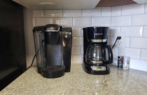 The kitchen is fully equipped with dishware, silverware, pots, pans, bakeware and both a Keurig and coffee pot. A full size washer and dryer are in a separate room right off the kitchen.