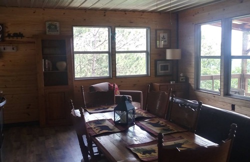 Kick back and let your worries disappear at the Whispering Pines Cabin. Behind a locked gate, our secluded cabin is best accessed with a Four-wheel Drive vehicle or at least a vehicle with higher clearance. Our cabin is Located on a 5.5 wooded acre tract with pines, hardwoods, creek, and amazing rock formations. Take advantage of hikes down to the creek for playing and enjoying birding and sounds of nature. The Whispering Pines Cabin is two separate levels. The 2nd floor is the main level with outside staircase to enter the open concept kitchen, living, and sleeping area with queen Murphy Bed. A full bath with shower is also on this main level. Large front and back covered decks are also on this 2nd level to enjoy the incredible views of the Potato Hills, Kiamichi Mountains, and Sardis Lake. The bottom level is a totally separate space that we have made into a private bedroom with comfortable king bed and leather loveseat, full bathroom with shower, and utility room with washer/dryer. This space also has a 60 inch TV with Roku for streaming, and DVD/Blue Ray player with an assortment of movies for a modern distraction, or if inclement weather keeps you indoors. The first level also has a large covered deck. Our three decks enable guests to enjoy the incredible views after you have enjoyed a day hiking to the creek on our property, fishing or playing at Sardis Lake, or taking in the wonders of nearby Talimena Scenic Byway with Winding Stair Mountain or Robbers Cave State Park. Or just kick back and watch for the Eagles flying above the lake or listening to the sounds of nature while drinking a hot cup of coffee and watching the incredible sunrise or amazing stars and night sounds. We have all you need to relax and unwind with a fully stocked kitchen complete with dishware, cooking utensils and seasonings. We also keep an assortment of books and games. Our rainwater collection and six stage UV treatment system offers incredibly good tasting and safe drinking and cooking water. No need to bring any bottled water here! We also have Starlink high speed internet so you will never miss phone communication since cell service is spotty in this area. If you have an emergency, need to check into the office, work from the cabin, or take a call for work, we've got you covered. Our cabin is great for a single person, one couple, two couples, or a family. For safety, we do not allow children under age 8. We have rugged terrain all around the cabin and property, and tall decks and stairs that are unsafe for younger children. For security, we have two outdoor security cameras. One at the front facing the driveway, and one at the back facing the back upstairs main door. Please send an inquiry if you have any questions. We will be happy to share our little bit of heaven with you.