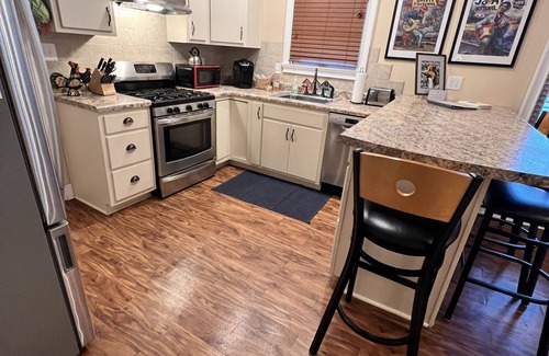 An efficiently designed custom kitchen with all new stainless steel appliances: standard sized refrigerator with ice maker, lovely 5 burner gas stove, small dishwasher, a drip coffeemaker, Keurig coffeemaker, microwave, toaster, as well as ample cookware to prepare meals.