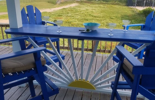 Unwind in Surfside Beach at this lovely cottage. Beachfront but set back so you can enjoy your privacy. This cozy retreat features a tropical bedroom with a king bed and a bunk bed for the little ones, perfect for a serene night's sleep. The living room offers a cool space to relax & has a sofa bed for additional guests. Enjoy Gilligans' amazing ocean side deck & bar where you can relax, gaze out at the ocean and listen to the sound of the waves on the shore, There is also a fenced pet yard with a comfortable sitting area so you can chill with your furry friends.AC, WiFi, and a washer / dryer insure a hassle-free stay. We're happy to assist with any questions during your stay in paradise.........