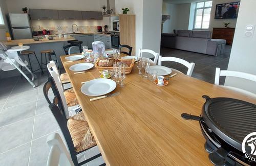 With family or friends, the Gîte du Pavement is ideal for getting together. You will enjoy warm moments here on the terrace under the sun of southern Mayenne or by the fireplace in the living room. On the ground floor: a living room of 40m² with fireplace and sofa bed. A 29m² fitted kitchen open to the living room. A bedroom for 2 people with a 160 bed, with its shower room and toilets accessible to people with reduced mobility. A laundry room with dryer, washing machine and sink. Independent WC. Upstairs: a bedroom for 2 people with 1 bed of 140, a bedroom for 3 people with 1 bed of 140 and 1 bed of 90, and a bedroom for 4 people with 4 beds of 90. A bathroom with shower Italian. Independent WC. In Craon all the shops, as well as a very beautiful aquatic complex with spa, or even a castle in the very refined style of the 18th century. The Rincerie leisure center is 10 minutes away: swimming, wake park (water ski lift), swin golf, mini golf, fishing, boat trip, nautical base, ornithological site, horse riding, mountain biking, bowling alley, games for children, . .. The forge museum in Denazé and the Robert Tatin museum in Cossé-le-Vivien are to be discovered. You can also stroll through the pretty streets of Château-Gontier and discover a wide variety of animals collected at the Refuge de l'Arche. Connected TV - Chrome-cast integrated - WIFI throughout the accommodation (fiber) - RJ45 sockets in all rooms and bedrooms. Small desk. Baby equipment: booster seat, high chair, changing mat, baby bath, travel cot and mattress. Cleaning is optional at 150€. The price of the stay includes beds made. Electricity on meter reading to be paid to the owner (> 8kWh/day). Animals not accepted. On entering the premises: the cleaning fee is requested in payment, and will be reimbursed on leaving as soon as the cleaning is correctly carried out. A large bedroom with a 160cm bed, adjoining its accessible private shower room: walk-in shower, high WC with ramp to hold onto. Washbasin without under-cabinet. Unless stated, services such as cleaning, bed linen, towels etc. are not included in the price of this rental. If pets are allowed (information in the advertisement), charges may be applicable. Only equipment mentioned in this advertisement are present. Equipment not mentioned are not considered to be present.