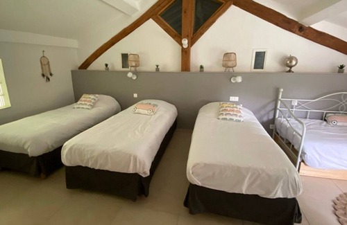 Discover the site of this isolated house of happiness and just 5 minutes walk from a superb body of water with an equipped beach, games for children and various attractions for a different vacation. The countryside all around with its local producers, its typical villages, its emblematic sites such as the Ingres Bourdelle Museum in Montauban, Moissac and its cloister or the famous Gorges de l'Aveyron and so many other visits to do... Plus, tennis accessible next to the gîte to end the day before enjoying some grilled meats on the barbecue on the terrace. The accommodation includes on the ground floor an entrance hall serving a living room (corner sofa, armchairs, table chairs, TV), an integrated kitchen (fridge, freezer, hob, microwave). A bedroom (1 160 cm bed, private shower room and toilet). Upstairs a large dormitory type children's bedroom (4 0.90 beds), private shower room and toilet), and via a passageway another bedroom (1 160 bed, private shower room and toilet) . Terrace with garden furniture, table and benches, barbecue, plancha). Bed linen and bathroom linen provided included in the price. travel cot high chair provided if necessary. Wifi in the accommodation free. Entrance to the leisure center included in the price of the stay for the number of people in the gîte. Free access to tennis and the pétanque court next to the gîte. Air-conditioned accommodation. Optional services to be paid on site and reserved before your arrival: - End of stay cleaning: €85.11 per stay Unless stated, services such as cleaning, bed linen, towels etc. are not included in the price of this rental. If pets are allowed (information in the advertisement), charges may be applicable. Only equipment mentioned in this advertisement are present. Equipment not mentioned are not considered to be present.