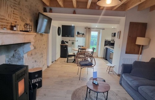 Whether for a romantic getaway, a tourist stay, a family visit or a professional stay, you will be charmed and seduced by this charming village house offering very nice amenities such as a large spa bath, in a chic environment, calm and authentic. Large living room with fully equipped kitchen, living room with sofa bed for 2 people (width 140), flat screen, pellet stove. 1 large bathroom with a top-of-the-range BALNEO bath to relax after a nice tourist stroll or a long day of work, double washbasin. Separate WC with washing machine/tumble dryer, laundry room, hair dryer, welcome gift Upstairs: 1 bedroom with 1 double bed. Sunny terrace with countryside views. Private parking at 200m with the owners nearby. Beds made on arrival. Bathroom linen provided. Unless stated, services such as cleaning, bed linen, towels etc. are not included in the price of this rental. If pets are allowed (information in the advertisement), charges may be applicable. Only equipment mentioned in this advertisement are present. Equipment not mentioned are not considered to be present.