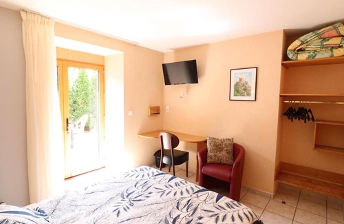 Fully furnished gîte on the ground floor: living room with flat screen TV, wifi Internet access, fully equipped kitchen area, one bedroom with 2 single beds and private bathroom with toilet, one bedroom with 1 160x200 bed, bathroom private water and separate toilet, possibility of single bed for child in sleeping area with bunk beds, flat screen TV in each bedroom. Beds made on arrival and linens provided. Gas central heating included in the price. Heating prices included.