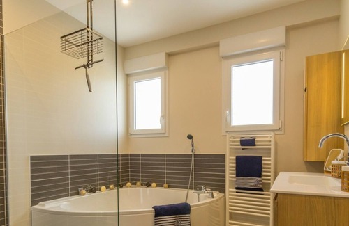Independent house. Ground floor: Living room with fireplace. Living room with open kitchen. Laundry room. Bathroom (bathtub and Italian shower). toilet. Bedroom 1 (160 bed). On the 1st floor: bedroom 2 (bed 140) with private shower room. toilet. Bedroom 3 (160 bed) with private shower room. On the 2nd floor: mezzanine bedroom (2 single beds). Bathroom. toilet. Bedroom 4 (bed 140). Baby equipment. TV. Stereo system with built-in speakers in the lounge and living areas. Internet. Washing machine. Dishwasher. "Dolce Gusto" pod coffee maker. Sheets provided for any stay of at least 3 nights. Bathroom linen not provided. Heating (PAC) included. All inclusive. Cleaning service at an additional cost. Private enclosed garden. Terrace. Garden Lounge. Barbecue. Deckchairs. Private parking for several cars. Classified as a UNESCO World Heritage Site, the emblematic Vauban tower proudly dominates the cove of Cul de Loup and its oyster beds. It is a few steps from these treasures that this elegant family home stands. With no less than 4 bathrooms and bedrooms spread over 3 levels, this is an ideal house to share the wonders of the Cotentin with others. Whether by the fireplace or on the large terrace, you will appreciate its comfort and privileged location (coastal path 150m away). On the floors, the view of the sea and the Hougue gives this seaside gite a lookout look! The price does not include: charging an electric or hybrid vehicle. Fireplace, 1 bedroom on the ground floor, TV, Washing machine, Dishwasher, Microwave, Freezer, Freezer compartment, Sheets provided, Baby equipment, Enclosed grounds, Internet access, Garden, Barbecue, Parking, Terrace, Garden, Detached house, optional cleaning service. Option to be paid on site: End of stay cleaning fee: €150. Unless stated, services such as cleaning, bed linen, towels etc. are not included in the price of this rental. If pets are allowed (information in the advertisement), charges may be applicable. Only equipment mentioned in this advertisement are present. Equipment not mentioned are not considered to be present.