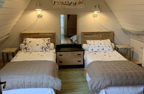 Upstairs, an open tread staircase leads to two double bedrooms. One bedroom has a king size bed and the other one has a couple of single beds. Duvets or covers are included.