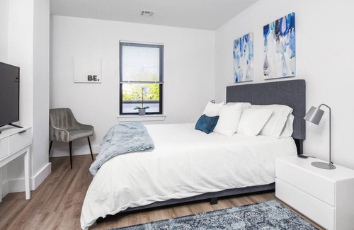 ✅Fast WiFi 300mbps✅Free parking with ev charger for eletric cars ✅24 hour gym ✅9ft ceilings Tall windows with vinyl floors✅wireless smartphone charging ✅55 Inch Roku Smart Tv 4K in living room and 43 inch Samsung smart TV 4K in bedrooms. ✅King size bed and queen size with memory foam mattress✅2 rollaway single beds for extra guests✅Kitchen Fully Stocked✅Linens, Towels, and toiletries provided.✅Washer and dryer in unit with detergent and softener dryer sheets provided.✅Work desk work remote ✅Professionally cleaned and sanitized after each stay.✅ 2 full bathrooms fully stocked