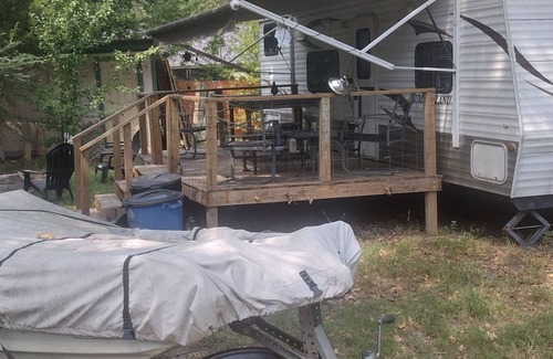 The travel trailer is located in a fenced in lot next to our lake house. Surrounded by large shade trees this trailer comes with a wood deck, two grills, picnic table, lawn chairs and large fire pit.