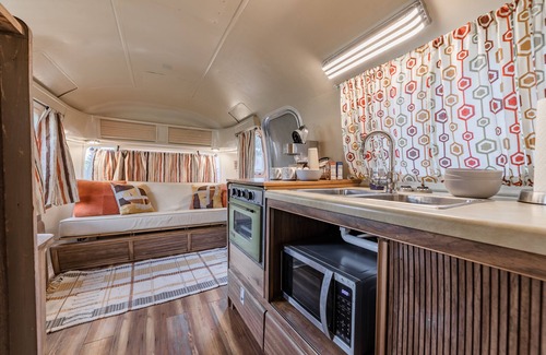 The Ambassador was originally created in 1977 by Airstream and has been newly renovated this past year with a fabulous wood floor and fresh decor! In this newest addition to our glamping retreat, there is a full working bathroom! She has two comfy twin beds in the bedroom and the couch in the front turns into another bed (its slightly larger than a twin bed, would certainly be cozy if your trying to sleep two). It comes equipped with a working kitchen sink, coffee maker, refrigerator, and microwave. We provide fluffy robes and towels for The Bath House. It also has its own private 10' x 10' deck attached with chairs and an umbrella. Perfect for catching up on all the latest or simply relax and take in the atmosphere with a fresh beverage of your choice. Everything you need for a fun getaway!