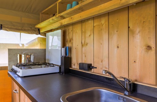Waking up to the chirping of the birds, as you wake up on a soft mattress. Your own shower and then breakfast on the veranda while waving to the neighbours. The kids can't wait to join the kids' club or swim. You yourself enjoy the peace and quiet while grabbing a cold drink from the fridge. That's the feeling of luxury camping you can experience here
