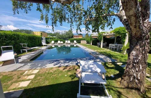 Very modern, beautiful house "Glicine", semi-detached. 3 km from the centre of Lucca, residential area (villas), 25 km from the sea. For shared use: swimming pool (11 x 5 m, depth 140 - 140 cm, seasonal availability: 15.May. - 30.Sep.). Outdoor shower. Private: garden (fenced) with flowers. Garden furniture, barbecue, children's playground, parking (for 2 cars). Supermarket 3 km, restaurant 5 km, bar 2 km, bus stop 100 m.