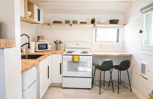Our 256 sq ft cabin is perfect for couple or a family with a small child. The cabin is a studio layout featuring a queen bed and a futon couch that folds out. The cabin has a full sized kitchen that is stocked with all of the cooking essentials you could need to prepare meals in during your stay. The bathroom boasts a large walk in shower, heated floors and a vintage wall mounted sink that was found on the property and restored!