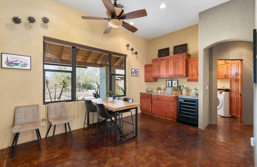 Spacious and open floor 2,677 sq. ft. of cozy comfort with a fully equipped kitchen, fireplace, and large windows to soak the 360 views of the majestic Superstition Mountains and famous Goldfield Ghost Town. Enjoy beautiful desert, clear sky evenings.. perfect for star gaze at night!