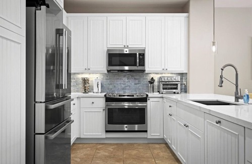 - Primary Bedroom/Bathroom – King Bed with private bathroom, Smart TV, dual vanity, shower, and separate tub with a walk-in closet and another closet