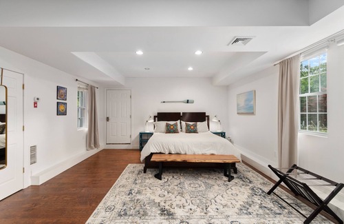 The guest house is a separate building from our main house, but right next door. Enter into the first floor, which houses a large master bedroom with high ceilings, a king-size bed and convertible futon (full-size). A pack n' play is available for infants. There are black out blinds and curtains throughout the downstairs and upstairs. There is an en-suite bathroom with a standup shower. An electric fireplace adds to the cozy ambiance. Just off of the downstairs hallway, you will notice a private porch with outdoor chairs for your enjoyment. In the summer months, we store beach equipment in the closet in the downstairs hallway for use during your stay.