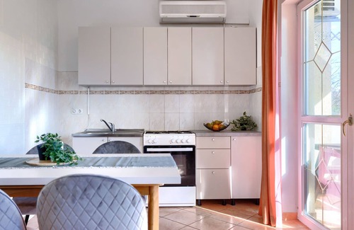 "Gordana", 3-room apartment 50 m2 on 1st floor. Living/dining room with 1 sofabed, satellite TV and air conditioning. Exit to the balcony. 1 room with 2 beds. 1 room with 1 french bed. Kitchenette (oven, 4 ceramic glass hob hotplates, toaster, kettle, freezer, electric coffee machine). Shower/WC. No heating option. Balcony 5 m2. Balcony furniture. View of the swimming pool. Facilities: Internet (WiFi, free). Please note: non-smoking house. The property is one of a type of property or apartment.
