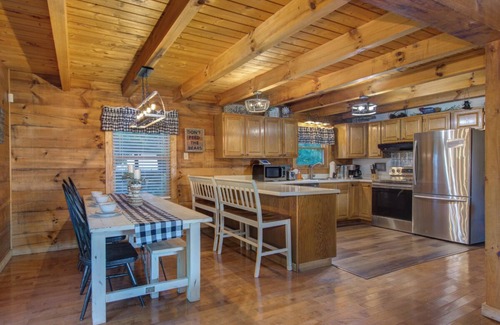 Newly furnished cabin with high ceilings, large wooden beams and a beautiful stacked stone fireplace; modern and updated kitchen, pool table, spacious living room, large bedrooms, luxurious high-end decor, incredible outdoor/indoor game cove, comfy couch, smart TVs throughout the cabin, children's nook, free Wi-Fi, mud room with full sized washer and dryer -- too much to mention everything!