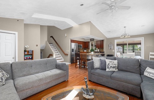 Downstairs family room has 2 additional twin beds and living room has a pull out queen sleeper sofa. Kitchen fully equipped. Brand new mini split a/c unit will be installed by may.