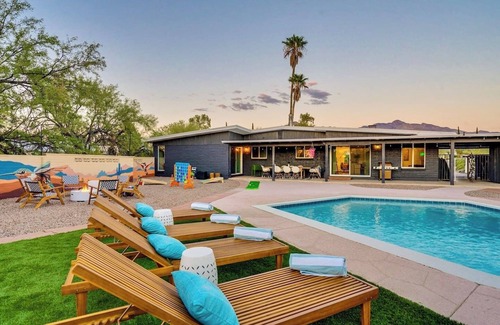 Welcome to Sonoran Sueños, your Tucson oasis! Inviting 4 bedroom, 2 bath house and a cozy 1 bedroom, 1 bath guest bungalow. Bask in the spacious resort-style backyard with pool, hot tub, fire pit, and outdoor games for endless fun. The main house is bright and inviting, with a fully stocked kitchen and comfortable living areas, while the guest bungalow offers a fun and private retreat. Private yet minutes from local dining and attractions, this home is the perfect base for your Tucson adventure!