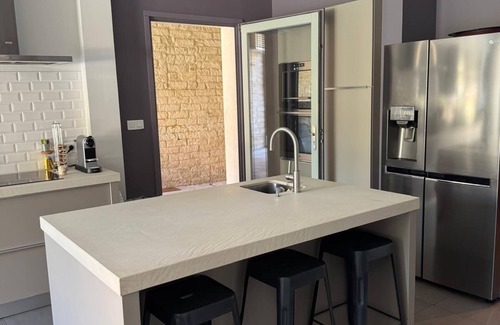 Large glass and iron doors open out to the garden and swimming Pool, which is surrounded by sun loungers and chairs to relax in. The garden is walled and to the rear of the property and so very private and quiet. The garden continues the modern style of the house, yet with local traditional plants, such as lavender, a 100yr old olive tree and a palm tree.