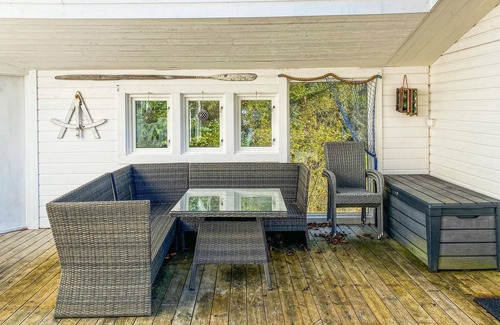 In a fantastic location by the sea, the inviting and spacious house welcomes you with a great view from the bright rooms and provides a cosy setting for your holiday, where you can refresh yourself in the sea at any time and fish all year round. After an eventful day, make yourself comfortable in the cosy ambience, dine together with a beautiful view and spend sociable evenings by the cosy crackling fireplace.