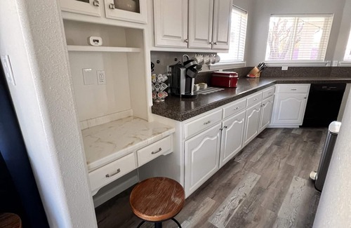 Luxurious living, new décor in a clean airy modern newly remodeled 2,100 square foot home next to the Albuquerque's Petroglyphs. Your out of town stay puts you next to the Petroglyphs Boca Negra Canyon with expansive walking and biking trails. This gorgeous custom home treats you to an Artesian Elite Eagle Crest Hot Tub which boasts 55 jets for a relaxing massage after a long day of exploring New Mexico. A Brunswick Pool Table in the middle of the full Bar for you to enjoy your favorite adult beverage while playing a game of 8 ball or 9 ball. Next to the bar is a 4 person retro gaming table top includes such classics as Pac Man, Donkey Kong, Pitfall, Galaga, Pinball, Casino, and even the original Pong, over 500 to choose from. If that wasn't enough, the house has Samsung "Frame" TVs in the living room and 2 bedrooms, which double as beautiful framed classic artwork and a full television to accommodate your streaming preferences. There is also a big screen in the bar so you can have your favorite team on while you enjoy a game of pool or a game of Ms Pac Man. The Primary Bedroom has a King Size bed, a Samsung Frame TV and a private bathroom with double sink, shower and spa jetted tub. It also has a walk in closet with plenty of space to store your clothing. Guest Bedroom 1 has a Queen Size bed with a Samsung Frame TV and closet storage for your clothing. Guest Bedroom 2 has bunk beds with the top bunk being a Twin XL and the bottom bunk a Full Size bed and closet space to store your clothing. A full living room with a 65" Samsung Frame TV to enjoy on leather loveseat and full couch with a pullout queen sofa bed. The kitchen has a full food prep island complete with vegetable sink. Kitchen Aid appliances including double oven and gas cook top. In addition to the hot tub/spa, the backyard is equipped with a Blackstone griddle and all the accessories to cook breakfast, lunch or dinner! Relaxing outdoor furniture and an outdoor TV to watch while you enjoy the beautiful New Mexico weather. A laundry room with full size washer, dryer, mud sink and all the supplies needed to get things clean and ready for the next adventure. This custom home has all the amenities you will need to create memories, experiences and the deep sleep you desire to dream of your New Mexico adventure. The home is fully equipped for all cooking, sleeping, and bathing needs for up to 7 people.