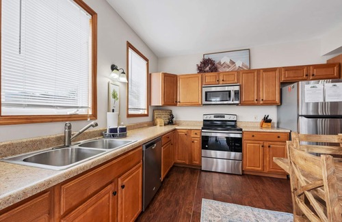 The main floor features a SPACIOUS LIVING ROOM with a gas fireplace, open beam ceilings & a BREATH TAKING MOUNTAIN VIEW. The sectional sofa is very comfy with lots of throw pillows and ottoman's for additional seating. The large 55" flat screen TV sits atop the fireplace mantle for easy TV watching. On the rear side of the living room has a sliding door which is open to the beautiful deck with gorgeous mountain views. The FULLY EQUIPPED gourmet kitchen sits off to the side with tons of counter space and eat in tables. Please note that there is room for 6 people to eat at one time. The kitchen is a wonderful place to cook a meal for your family while taking in the breathtaking mountain view from any of the 3 windows. A high chair is provided for those with small children.