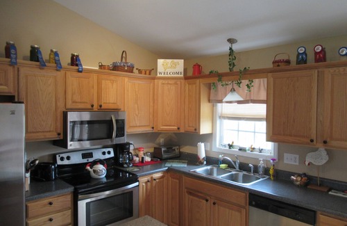 Vinyl siding Home built in 2012 on one level with a full basement. Long porch on front and deck on back with patio underneath. Master bedroom king size bed and large master bath with shower and garden tub. Two bedrooms, with queen beds . All bedrooms have walk in closets. Full bath with tub and shower in hall. Family room and eat in kitchen combination with stainless steel appliances and cathedral ceiling. Laundry room with washer and dryer furnished. Full walk out finished basement with ground level patio. Great room with propane gas stove and game room with pool table. Second master bedroom with full shower bath, king size bed.