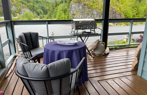 Enjoy spectacular ocean views at The Cottage at the Cove Studio Suite. You just might see Killer Whales, Humpback Whales, the odd Minke Whale, Dolphins, Porpoises, Sea Lions, and Sea Otters swimming by. There are also Bald Eagles, Deer and more that you can see right from the comfort of your room. Some of the most gorgeous sunsets ever are able to be seen from the oversize windows designed to capture the views of the ocean and mountains. The suite was completed in May 2024 and features high 8'3" ceilings throughout the unit. The cabinets are topped with luxurious quartz counters, residential fridge/freezer, stove, oven, microwave and all you need to bring in is your food and drink. If you don't feel like cooking the Killer Whale Cafe and the Saltery Pub offer great food and drinks and they are only a short walk from your room. The bathroom features an oversized shower with porcelain tiles and glass rolling shower door. The property and suite is tastefully decorated with the ocean in mind with nice touches like nautical pictures and ornaments, real used fish net floats, old weathered rope and old rough boards and logs from Telegraph Cove. There is a permanent queen bed and if you need additional bedding , we just added a sofa "Hide a Bed" for an extra couple adults or children. We are located a short walk from the Historic Telegraph Cove in the residential area, but far enough away to be very quiet and relaxing. It is close to many walking trails and a short drive to a few local lakes up in the mountains. There is a private barbecue area with a table and chairs for those evenings you want to take in the views and fresh air. The suite has free parking for your vehicle and also free wifi. You can stream on the large new flat screen TV. If you are looking for Bear, whale and nature watching we can connect you with the right people. If you are looking for world class fishing, whale watching and Grizzly Bear Watching, Telegraph Cove is where you want to be. We are the Gateway to the Broughton Archipelago, BC's largest marine park and the mountains offer some of the most incredible wildlife for your viewing pleasure. If you are looking to charter a private luxury cruise around the area or a fishing adventure we have a brand new 2825 Kingfisher boat loaded with amenities including a private bathroom with flush toilet, heated cabin, fridge, dinette area and all the latest in electronics and safety gear. We have binoculars on board and a high end non skid back deck for viewing the scenery and wildlife. The captain has over 40 years experience in the area and plans to be fully licensed for the 2025 season. We highly recommend you book a Tide Rip Grizzly Adventure Tour as well as Prince Of Whales, Whale watching. They are both first class companies that provide a memorable experience. Come join us at what is our favourite place on earth.