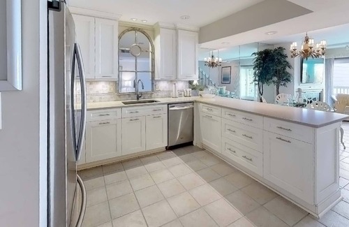 Enjoy the new open floor plan downstairs! The crisp new kitchen boasts all new stainless steel appliances, custom cabinetry offering lots of storage, beautiful quartz counter tops, and tile flooring. Beyond the kitchen is the living and dining area which offers a new wine bar, complete with an under counter cooler. The dining area offers seating for four while the living room boasts a 65" large flat-screen TV with Blue Ray, and DVD and direct access to the porch with lovely ocean and pool views! Also downstairs is a guest bedroom with two twin beds and a 32” flat screen television, a bath (with a hairdryer!) shared with the hall, and a laundry room.