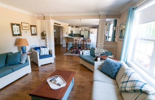 We have a large den with two sofas, a love seat and chair to enjoy the 55" television or Boze wave radio. There is plenty of room to enjoy playing games or putting puzzles together with your loved ones. The living room/ sitting room is set up to enjoy the gorgeous views of the river, reading or enjoying quiet conversations with your family and friends. There is a folding table in the sitting room that can be accessed for additional dining or for putting together puzzles if that's your thing.