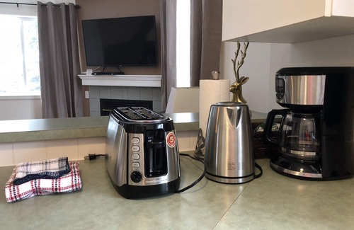 This secluded 2-Bedroom townhouse Suite includes all new furniture, fresh linens, a gas fireplace, Mini-Split A/Cs, and a fully-equipped kitchen for any culinary needs. We also offer free WiFi, parking, communal outdoor hot tub, BBQ area access, and coin-operated laundry facilities on-site for your convenience.