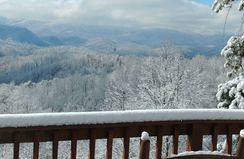 This cabin will not disappoint! "All About The View" is appropriately named. The view is absolutely spectacular. Regardless of the season views are breathtaking. The view is 180 degrees and can be enjoyed from an over sized hot tub, outdoor dining table or through several widows from inside. Resort pool is available in season! (Memorial Day thru Labor Day)