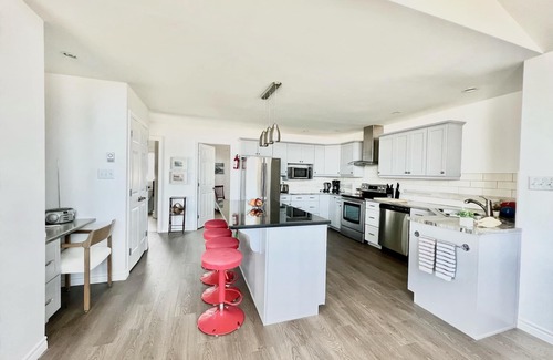 The open-plan living area blends the living room, dining space, and kitchen with grey cabinetry, white walls, and vibrant red accents. The kitchen is fully equipped for all your meal needs, with a modern wooden dining table and a peninsula with stools for casual dining or planning your day. You can also cook outdoors on the gas grill while enjoying ocean views. Appliances include stove, dishwasher, microwave, fridge, washer/dryer, and the outdoor BBQ. The living room has a sofa bed for two guests, a Roku TV, high-speed WiFi, propane fireplace, and breathtaking views across the water to Cavendish.