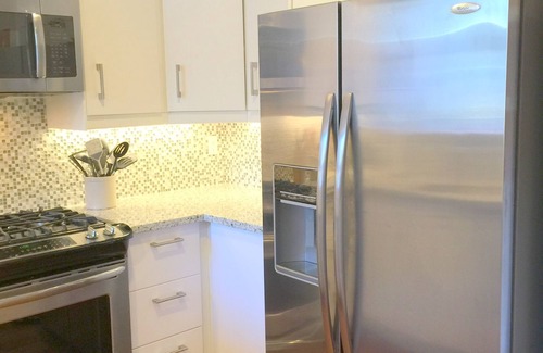 We are major cooks, so the highly functional new U-shaped IKEA kitchen with a slab granite counter top and glass and stone tile back splash is very well-equipped, with new appliances and the best cooking equipment. It includes a high-end GE refrigerator plus a Jenn-aire gas stove with convection oven and warming drawer and a brand-new built-in microwave and new LG stainless steel dishwasher. The kitchen features a a Cuisinart food processor, a Cusinart counter-top toaster/broiler/ convection oven, an InstaPot, blender, juicer, etc. Plus, since we love to entertain, you will have beautiful dishes, glassware, and linens of all sorts. We keep a supply of spices and basic condiments for your use.