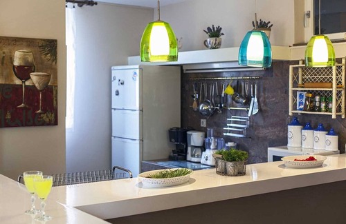 Whilst the exterior of the villa is traditional Mediterranean architecture, the interior is modern with white furnishings and amenities. The large living room has a comfortable corner sofa and television set which you can enjoy. This leads into the kitchen and dining room area, which is decorated with bright, colorful lights. You will find everything you need to create home-cooked meals in this kitchen and enjoy them with family or friends. Be sure to check out the beautiful light fixture above the dining table, which catches the sunlight and creates a beautiful effect on the white furnishings.