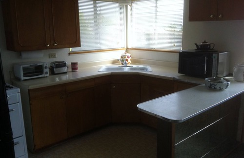 Unlike staying at a hotel, you will have a full kitchen, small-full-sized refrigerator, and full-sized stove (experience the spotless '50s-vintage O'Keefe & Meritt-including full-sized oven, broiler, even a built-in griddle for your homemade pancakes! They don't make 'em like this anymore...), microwave, dining table for four, with view.