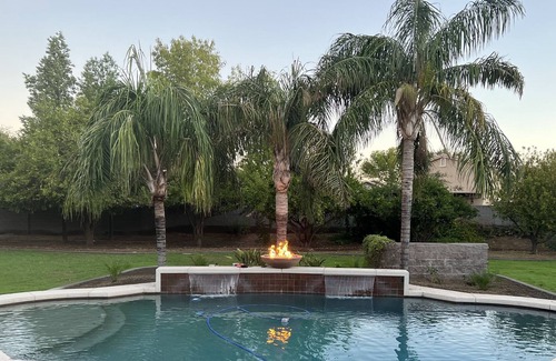This beautiful, spacious 5 bedroom home is located in the highly sought after Queen Creek Ranchettes Neighborhood in the town of Queen Creek, AZ. This amazing, single story home sits on a 3/4 acre lot. It is great for events or family gatherings. It has a large back yard, refreshing pool, fire pit, new furnishings, private master bedroom, 4 additional rooms with walk-in closets, 2 large garages and extensive driveway. Kitchen is equipped with a Keurig coffee maker (with coffee pods supplied), toaster, cooking utensils, dishes, glasses, eating utensils, mixing bowls, pots and pans and much more. Home has 1 King Bed, 3 Queen Beds, and 2 Twin Beds. Washer and dryer available for use on the premises. Towels and linens are provided. This home is perfect for family getaways.