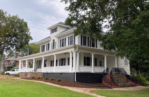 Vacay in style at this grand historic home close to downtown Pickens, SC! Your entire group will be comfortable in this luxurious space with 5 oversized bedrooms (all with attached bath) and lots of indoor and outdoor spaces for everyone to spread out … or gather for conversations! There is a large sun room on the main floor, plus extra-wide wrap-around porch and large back deck. Walking distance to downtown Pickens and the Doodle Trail for walking or biking.